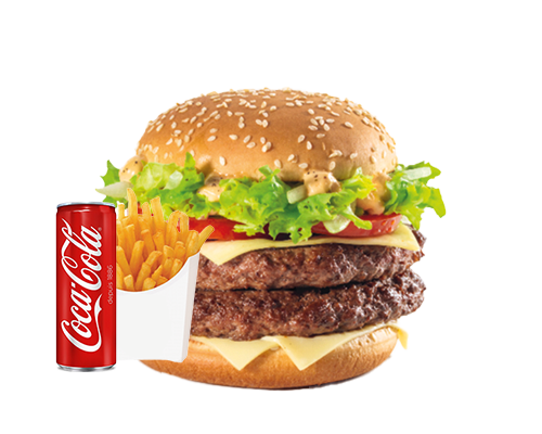 2 steaks de 100g, salade, cheddar, cornichon, oignons rouges et sauce deluxe